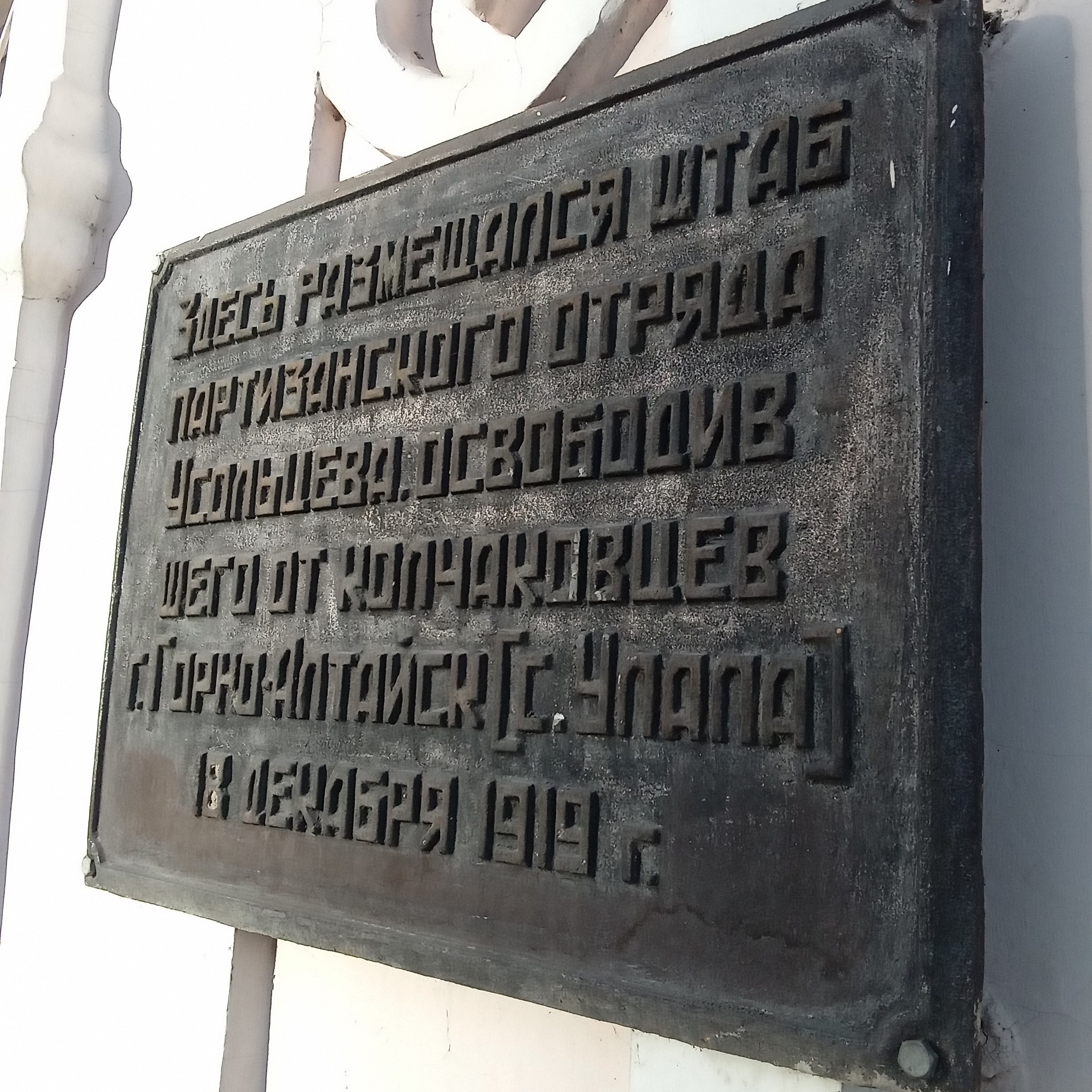 Уже больше 50 лет на здании Института алтаистики им. С.С. Суразакова висит простая чугунная табличка: «Здесь размещался штаб партизанского отряда Усольцева, освободившего от колчаковцев г. Горно-Алтайск [с. Улалу] 18 декабря 1919 г.».