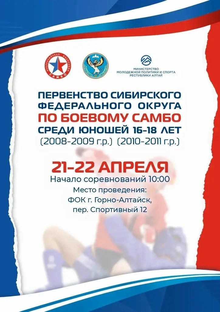 21-22 апреля в Горно-Алтайске пройдет Первенство Сибирского федерального округа по боевому самбо среди юношей до 16 и до 18 лет. Соревнования являются отборочными на Первенство России.