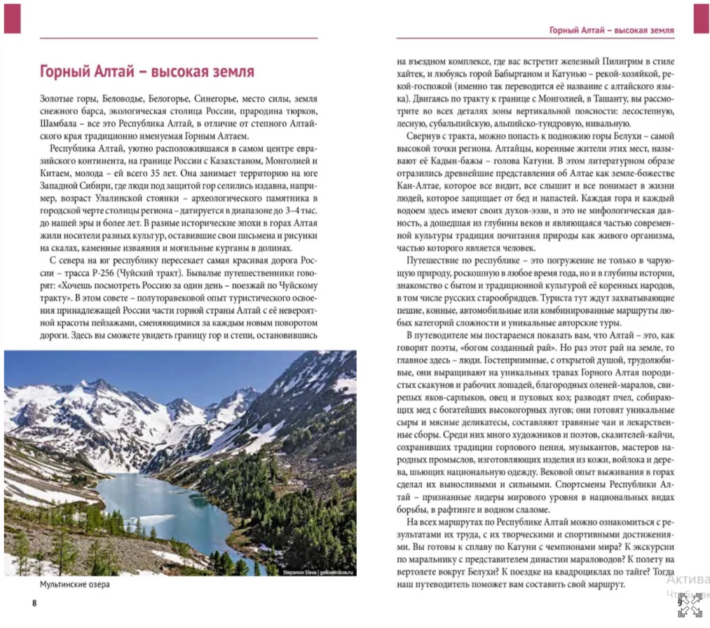 В серии путеводителей «Русский гид» (издательство «Полиглот») впервые вышло издание, полностью посвящённое Республике Алтай . Это событие, которого давно ждали и путешественники, и профессионалы туристической отрасли.