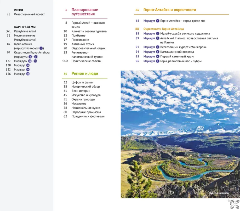 В путеводителе собрано 18 продуманных маршрутов и 8 подробных карт, которые помогут открыть для себя всю красоту региона. Издание станет отличным спутником для поклонников экотуризма, активного отдыха и тех, кто ищет уединения с природой . Особую ценность книга представляет и для специалистов: актуальная информация о маршрутах и инфраструктуре станет надёжной базой для развития туризма на Алтае.