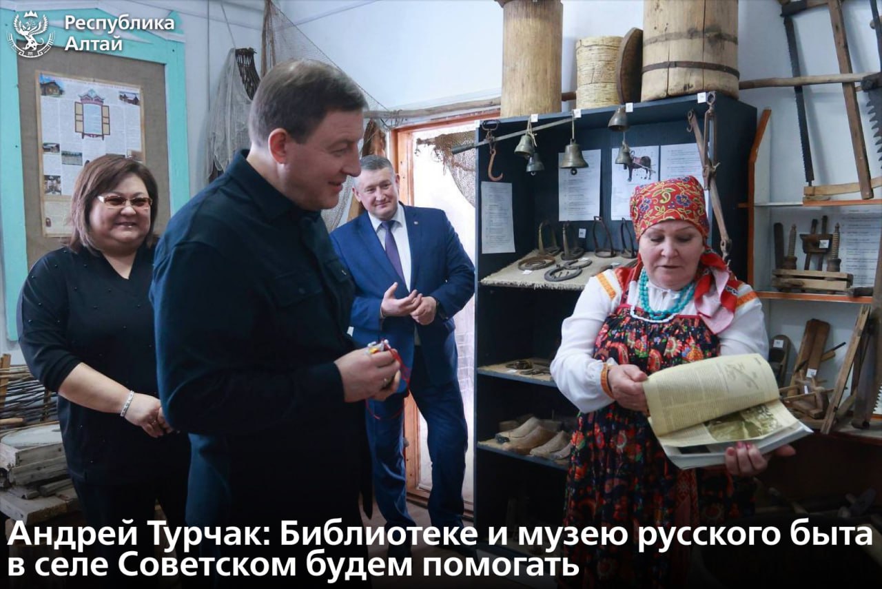 Глава Республики Алтай Андрей Турчак провел очередной день муниципалитета в Чойском районе. В селе Советском он посетил библиотеку, в которой также размещен музей русского быта.