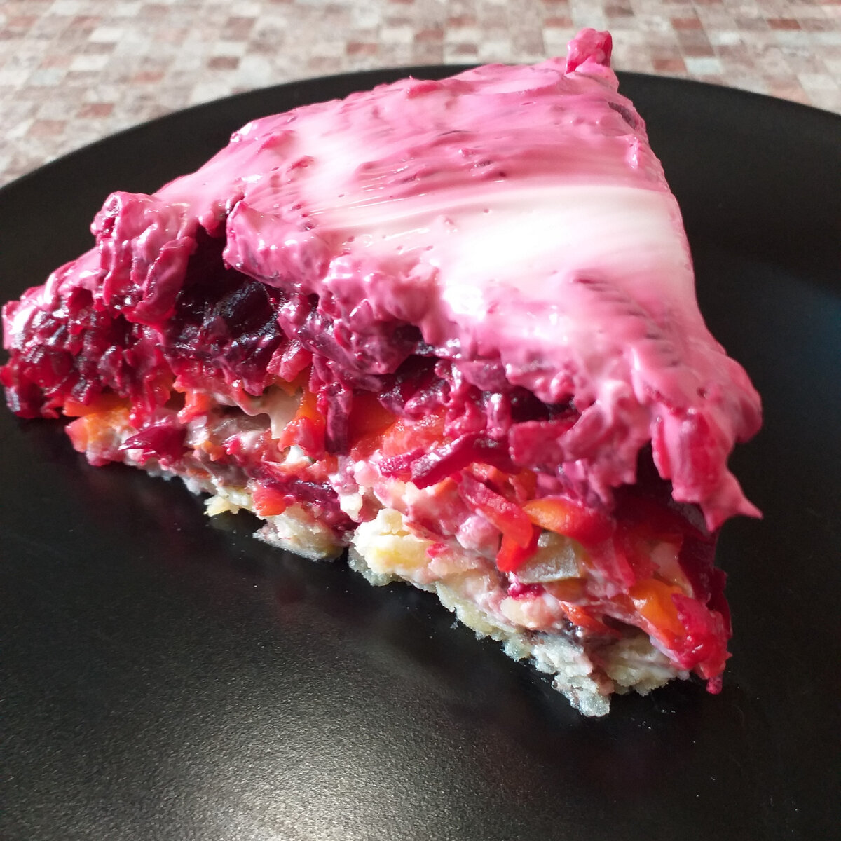 - Затем натирают вареную морковь, а поверх нее — слой свеклы.