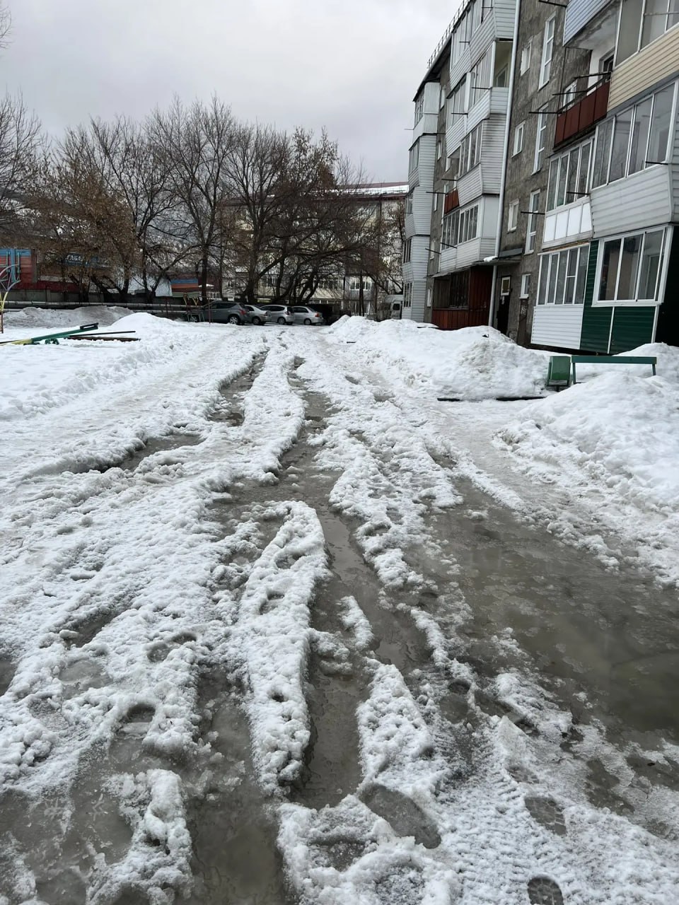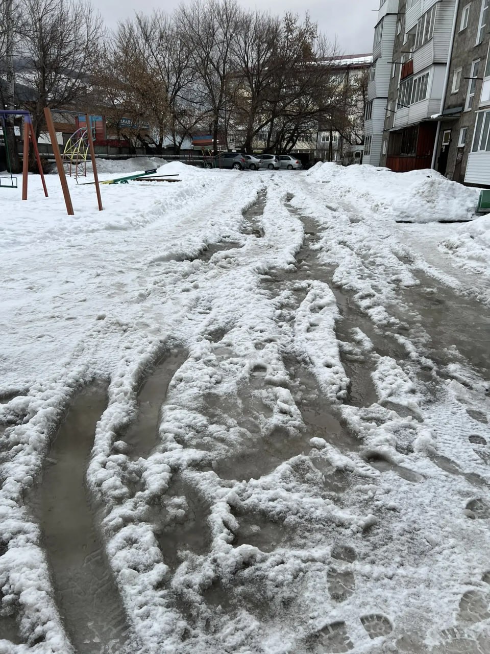 Обращение к коммунальным службам по поводу состояния Гранитного переулка 3 и 7, Горно-АлтайскФото сделаны сегодня. Двор превратился в сплошную кашу из снега, воды и льда. Колеи по колено, пройти невозможно, проехать — тем более. Во дворе находятся жилые дома и детская площадка, ежедневно ходят дети, пожилые люди, автомобили. Как заехать скорой? Как заехать пожарным (в ноябре подъезд горел, например)?