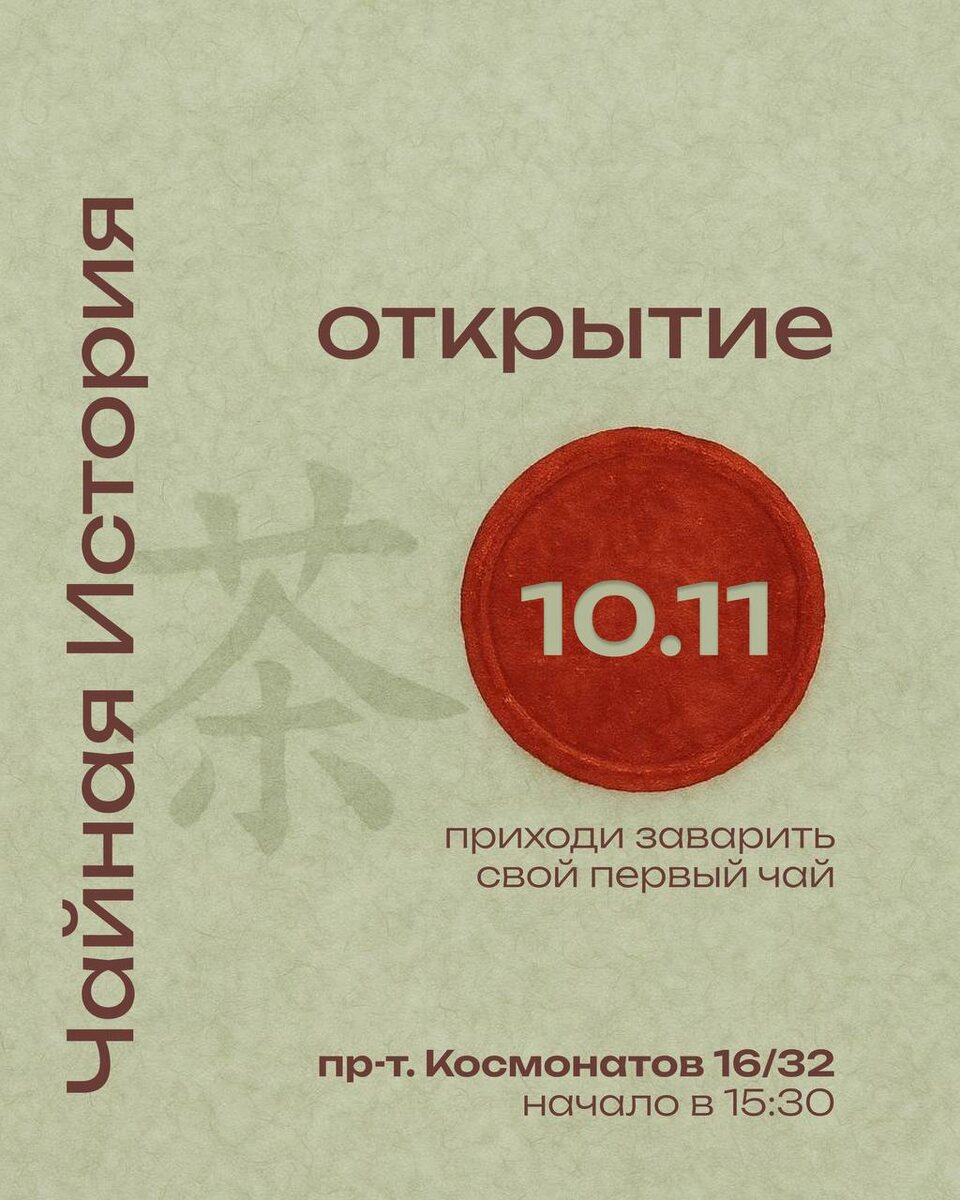 Дата и время открытия: 10 ноября в 15:30. Этот момент символизирует начало новой главы, и как говорят, по фэн-шуй – идеальное время для новых начинаний, ведь мы не просто разрежем красную ленточку, а запустим новую «Чайную Историю».