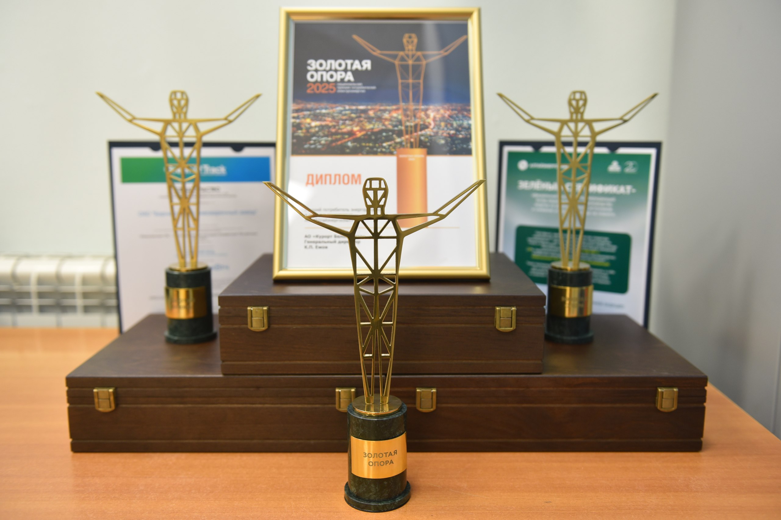 Зелёный сертификат, подтверждающий производство электроэнергии из возобновляемых источников энергии, был вручен генеральному директору аэропорта Андрею Метцлеру в качестве награды предприятию-победителю ежегодной премии «Золотая опора».