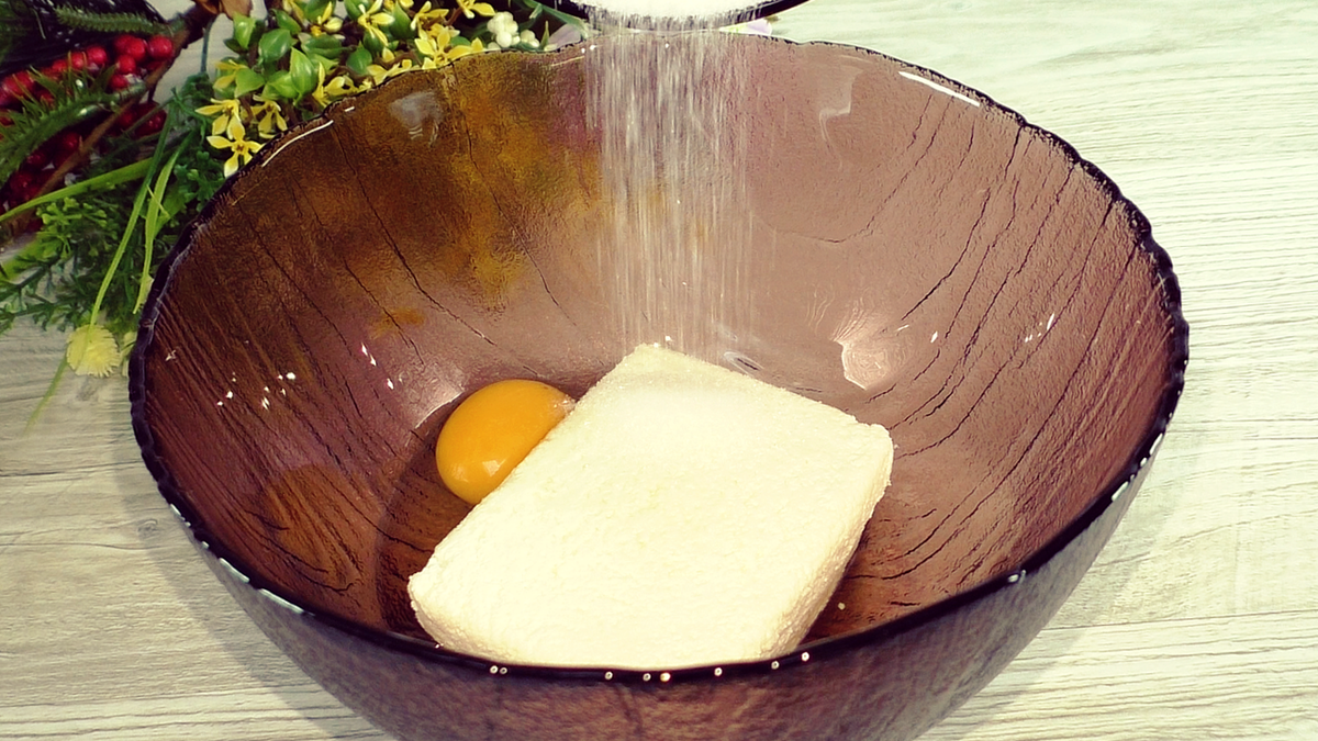 Начнем с творожной заливки. В глубокой миске соединяются творог, яйцо и сахар. Следом добавляют сметану и крахмал (если его нет, можно взять муку). Хорошо перемешать — лучше всего воспользоваться погружным блендером, чтобы добиться однородной консистенции без кусочков творога.