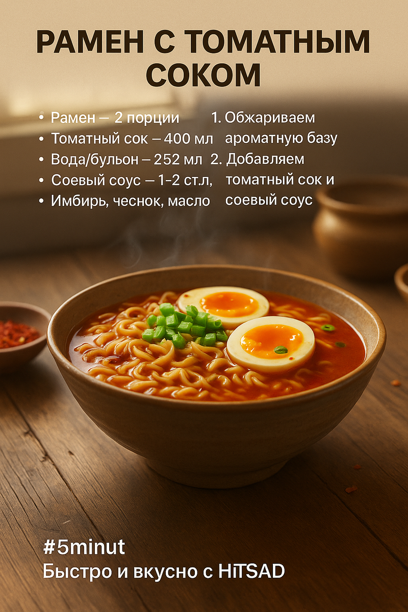 Этот яркий и насыщенный рецепт рамена с томатным соком не только удивит вас оригинальным вкусом, но и быстро окажется на вашем столе. За считанные минуты можно создать удивительное блюдо, которое станет настоящей звездой любого ужина. Теперь классический рамен обретает свежие нотки благодаря простому, но эффектному сочетанию ингредиентов.