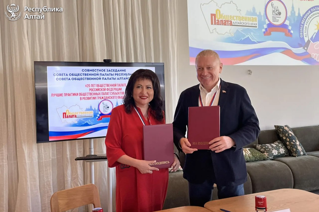 По итогам заседания Общественные палаты Республики Алтай и Алтайского края подписали соглашение о сотрудничестве. Стороны договорились обмениваться опытом и лучшими практиками.