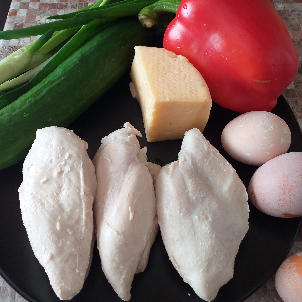 Куриное филе следует отварить до готовности (около 25-30 минут) и нарезать небольшими кубиками. Затем следует промыть и также нарезать свежий огурец, избегая семенных частей, чтобы избежать излишней влаги. Зеленый лук нарезать мелко, а яйца отварить всмятку и нарезать кубиками, сохраняя два белка для украшения.