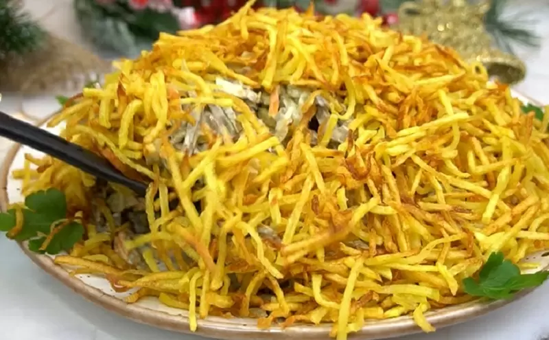 Салат можно подавать как в большой салатнице, так и порционно, формируя небольшие башенки. Украшение хрустящей картофелем придаст блюду завораживающий вид и сделает его центром внимания на праздничном столе. Попробуйте экспериментировать с добавлением свежих овощей или даже сыра фета для создания нового вкусового контраста.