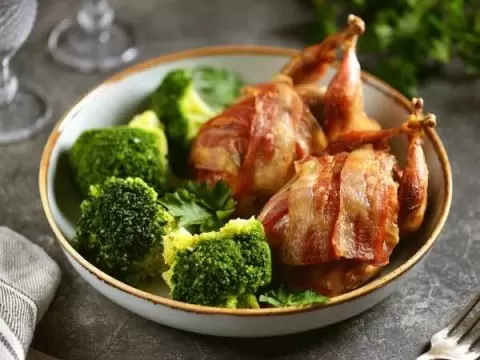 Перепелиное мясо славится высоким содержанием белка, витаминов группы B и минералов, включая железо и фосфор. Это низкокалорийный продукт, который легко усваивается. Бекон, добавляя насыщенный вкус, делает перепелов особенно сочными и вкусными.