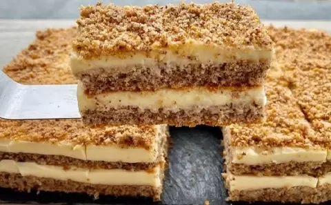 - Для коржа: 3 крупных яйца, 10 г ванильного сахара, 120 г обычного сахара, 120 мл молока, 120 мл растопленного масла, 200 г муки, 12 г разрыхлителя, небольшая щепотка соли, 60-70 г орехов.