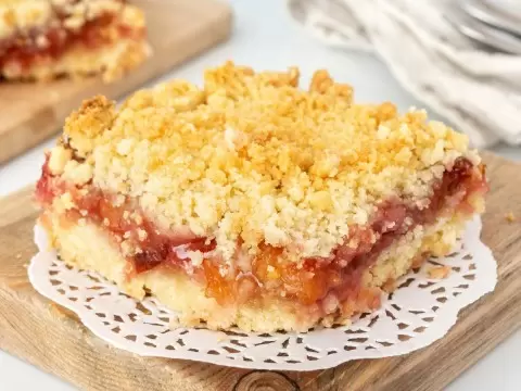 Этот пирог отличается рассыпчатой текстурой и сладким вкусом, в каждом кусочке четко ощущается аромат варенья. Благодаря методу приготовления, тесто остается воздушным и не теряет форму, идеально подходит для варенья или повидла с густыми кусочками фруктов.