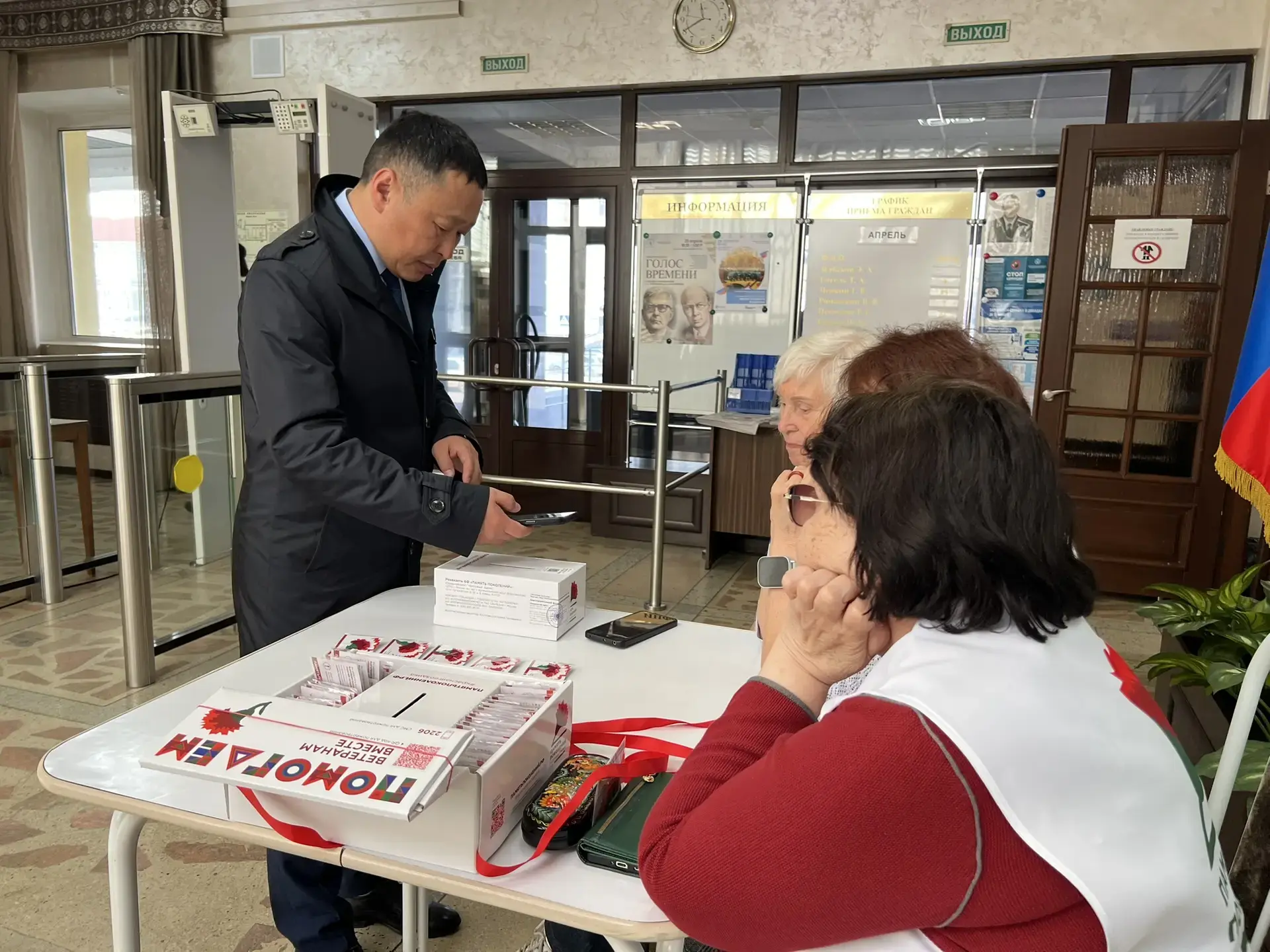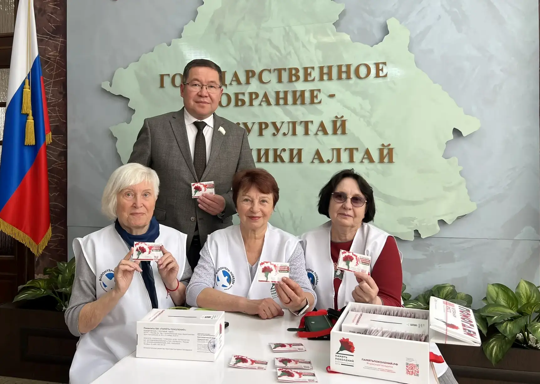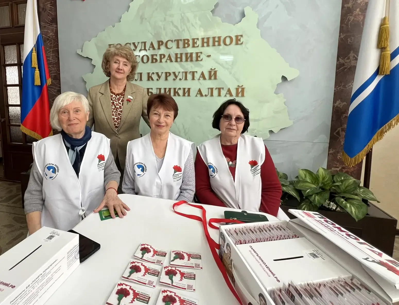 «Серебряные Волонтёры Победы» по традиции присоединились к сопровождению мероприятия, чтобы каждый мог внести пожертвование и получить памятный значок с символическим цветком – красной гвоздикой.
