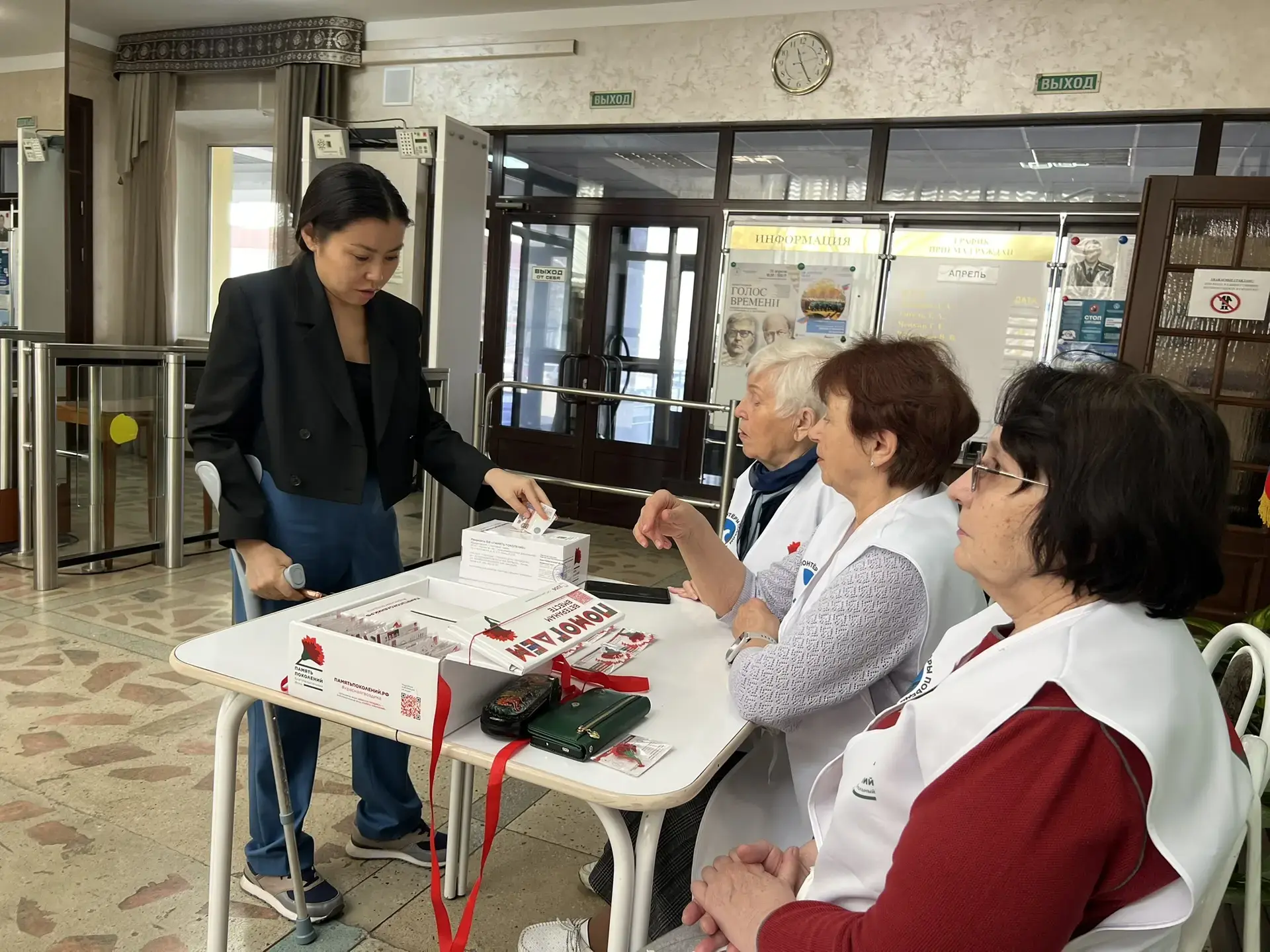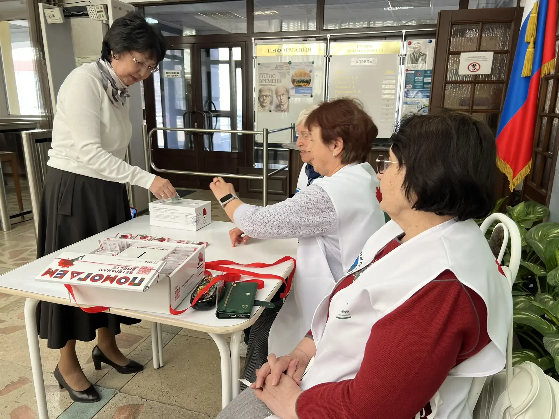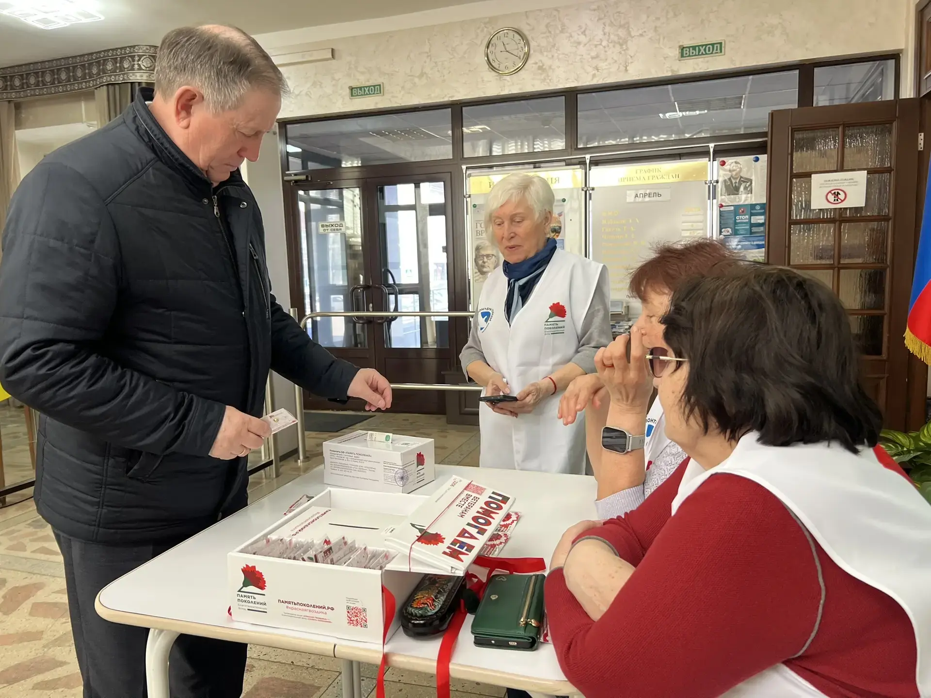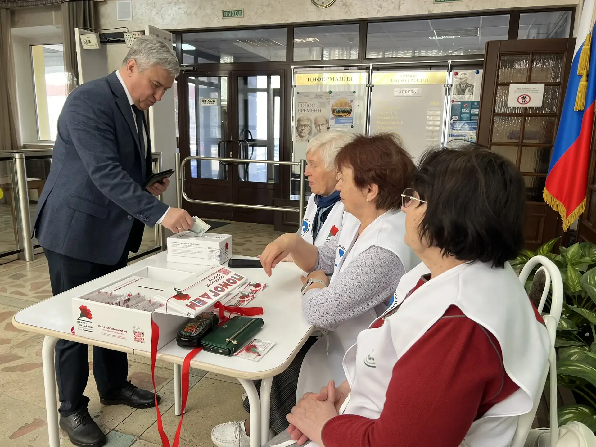 «Серебряные Волонтёры Победы» по традиции присоединились к сопровождению мероприятия, чтобы каждый мог внести пожертвование и получить памятный значок с символическим цветком – красной гвоздикой.