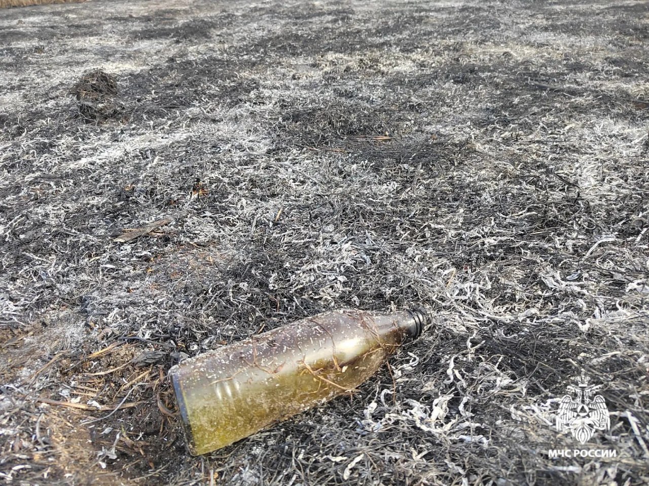 Предварительной причина пожара стала детская шалость: траву подожгли с помощью стеклянной бутылки, используя эффект преломления солнечных лучей через стеклянную призму, сообщает МЧС по Республике Алтай.