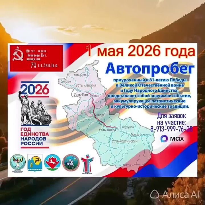 Автопробег, приуроченный к 81-летию Победы в Великой Отечественной войне и Году народного единства, пройдет по маршруту Усть-Кокса – Усть-Кан 1 мая.