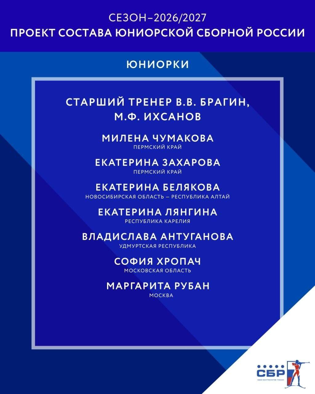Исполком Тренерского совета Союза биатлонистов России согласовал состав юниорской сборной России на сезон 2026-2027 годов.